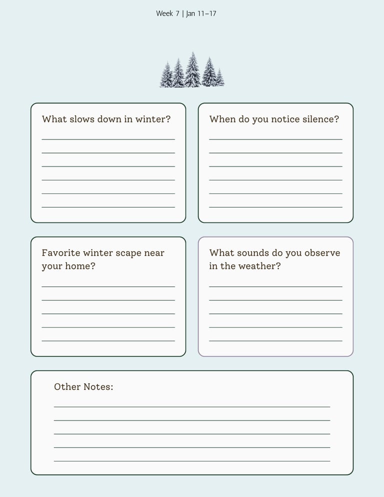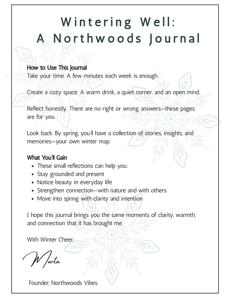 Wintering Well: A Northwoods Journal. Slow down this season. Capture moments of quiet, notice the small joys of winter, and reflect on what matters most. This free journal is designed to help you pause, breathe, and enjoy the rhythm of the Northwoods — one day at a time.